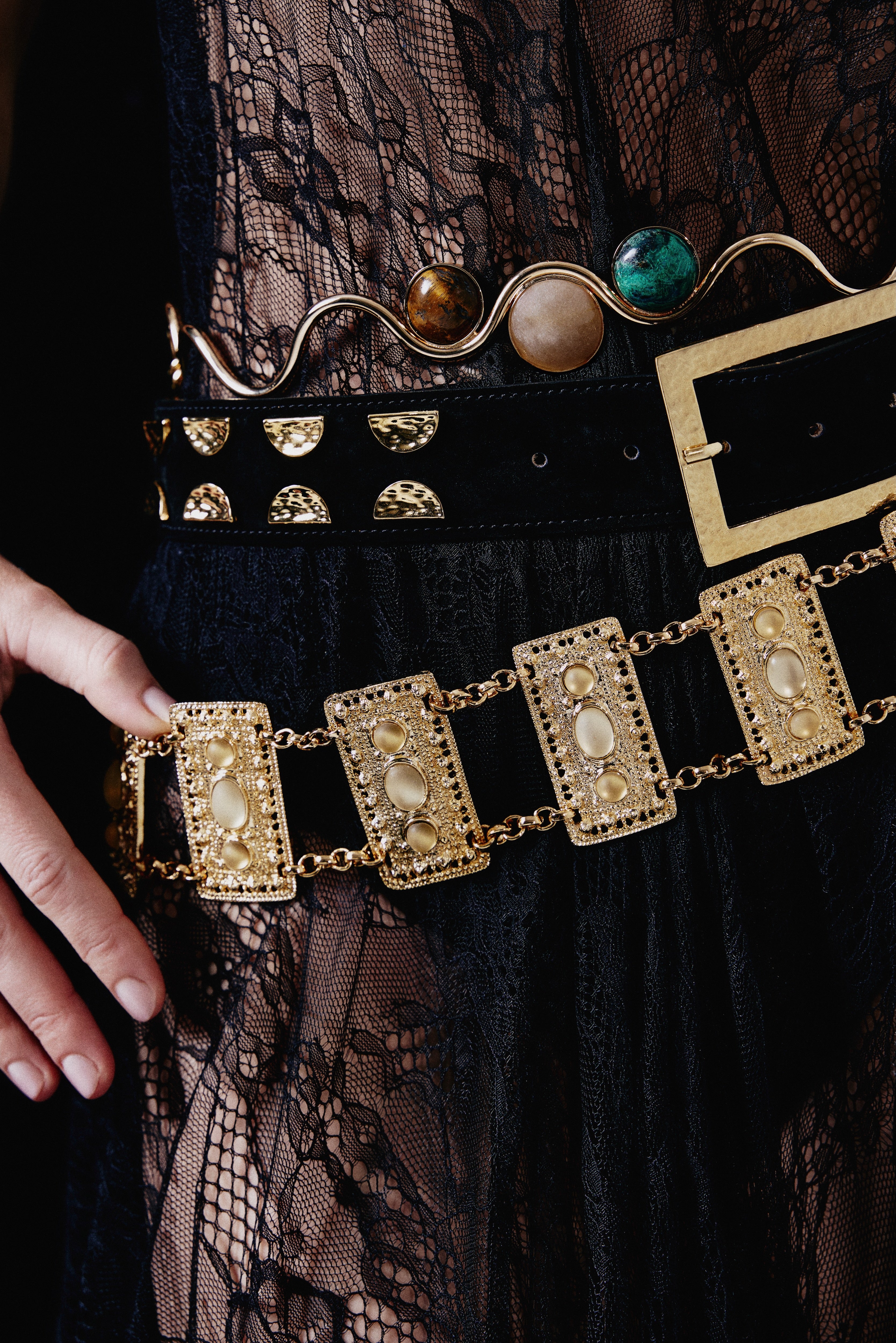 Um "power" cinto GIGI, o modelo Gatto é feito em camurça e tacheado com apliques texturizadas em formato "meia lua". Sua fivela retangular também é um destaque, apresentando a mesma textura das tachas. Perfeito para quem ama um acessório marcante e sofisticado!