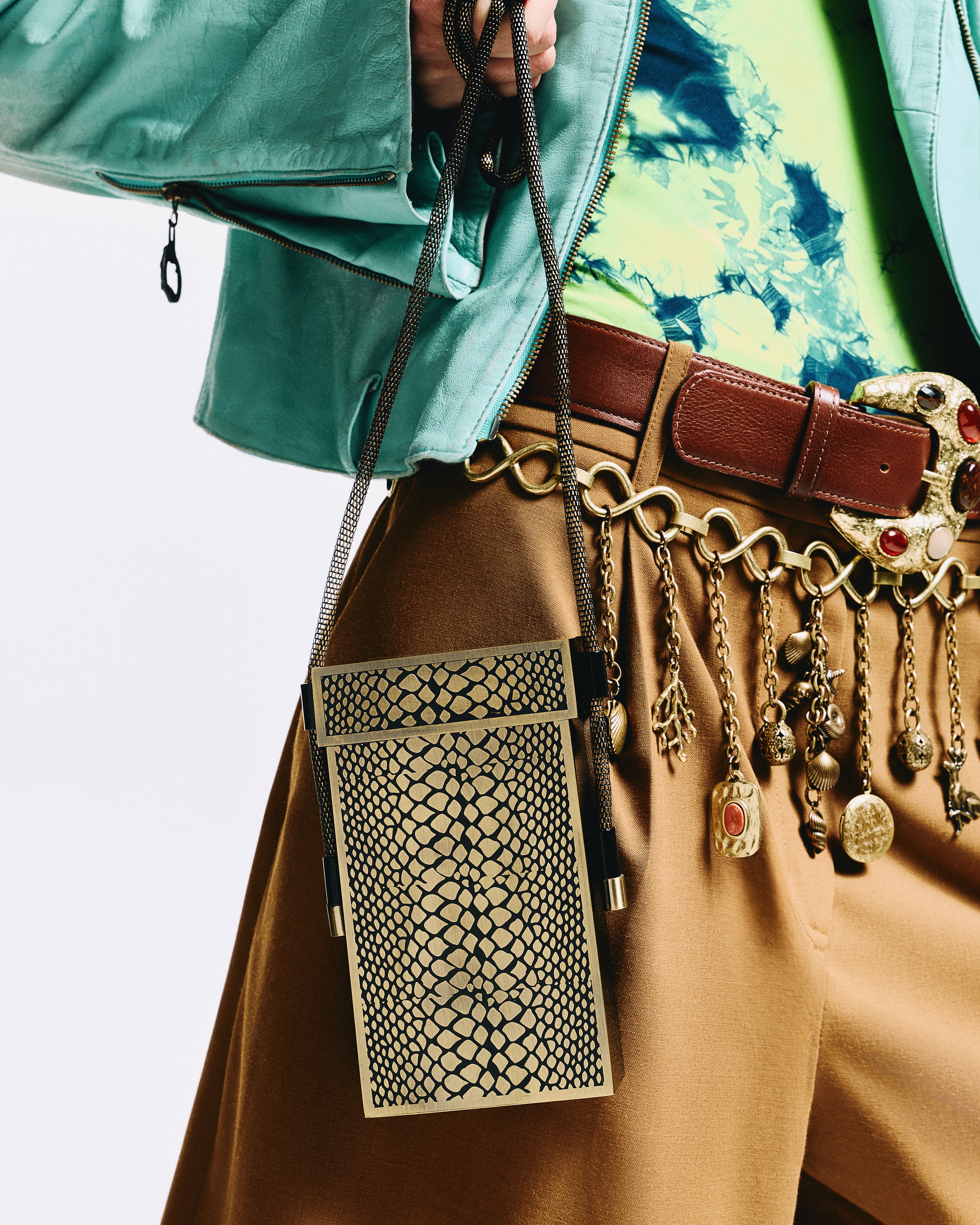 Acabamento primoroso e design atemporal são características certeiras da bolsa Gia. Com shape box e estampa de Python marcando em baixo relevo o metal, ela é arrojada e chique. A alça de corrente roliça aramada lembra o corpo de uma serpente o que confere um detalhe singular à peça.
