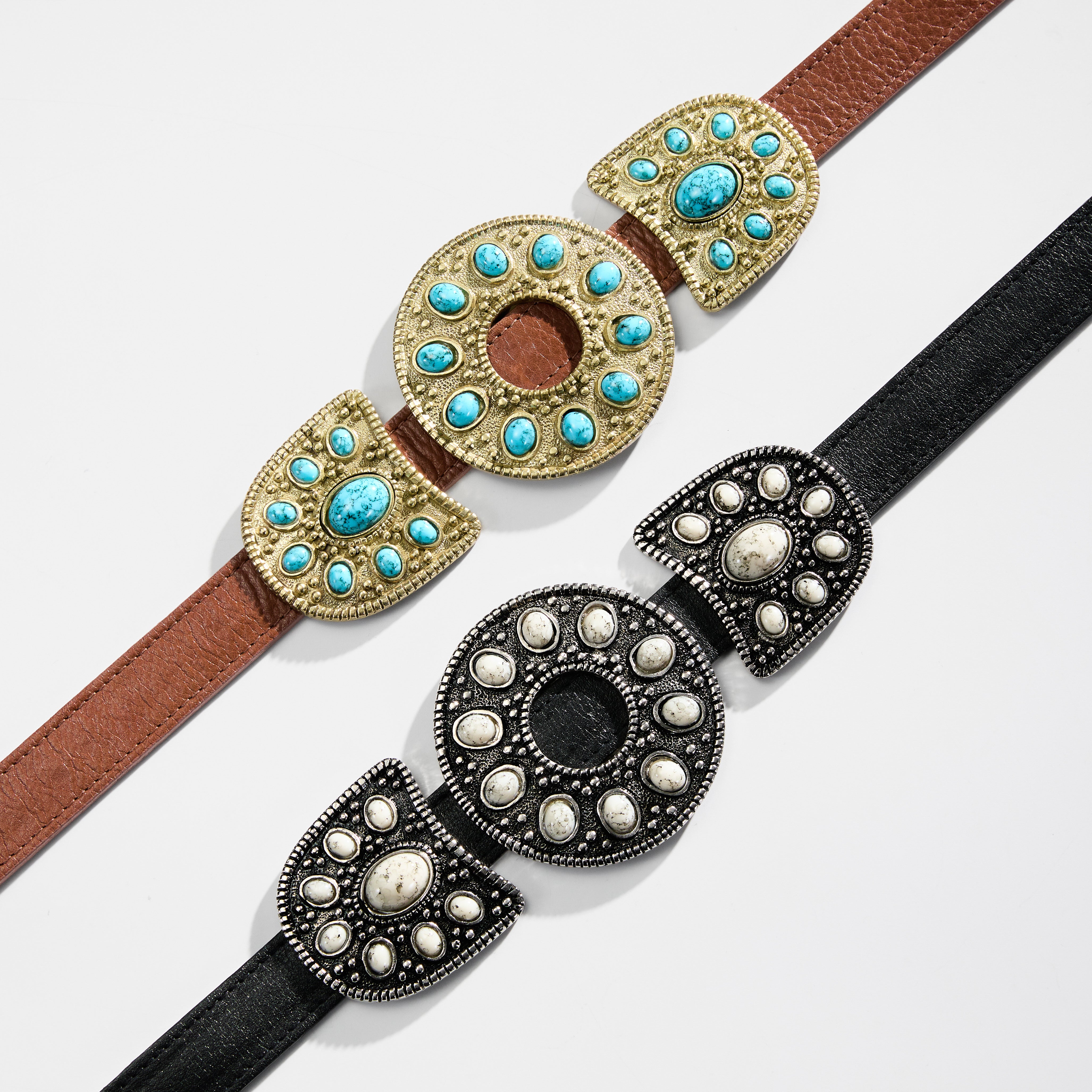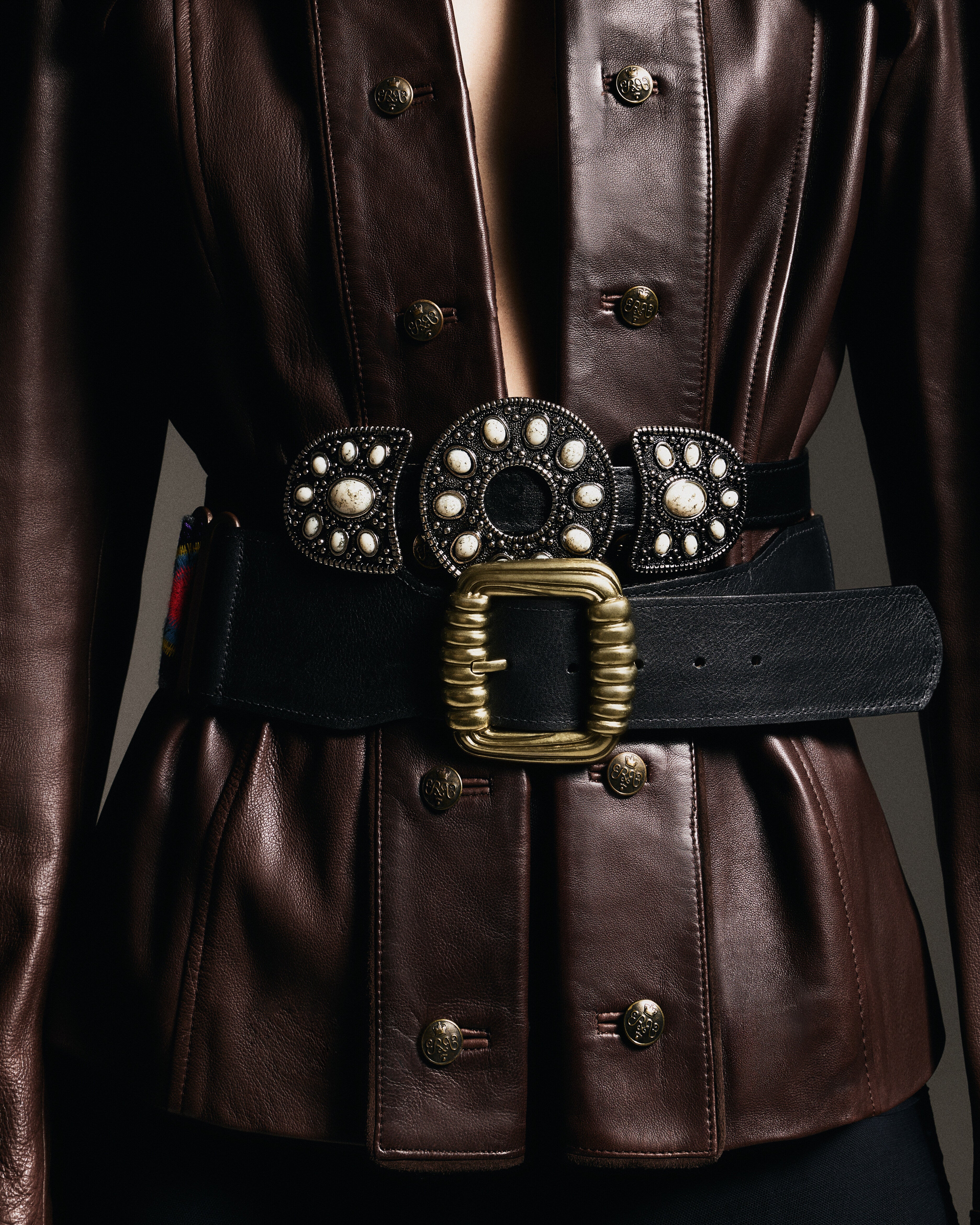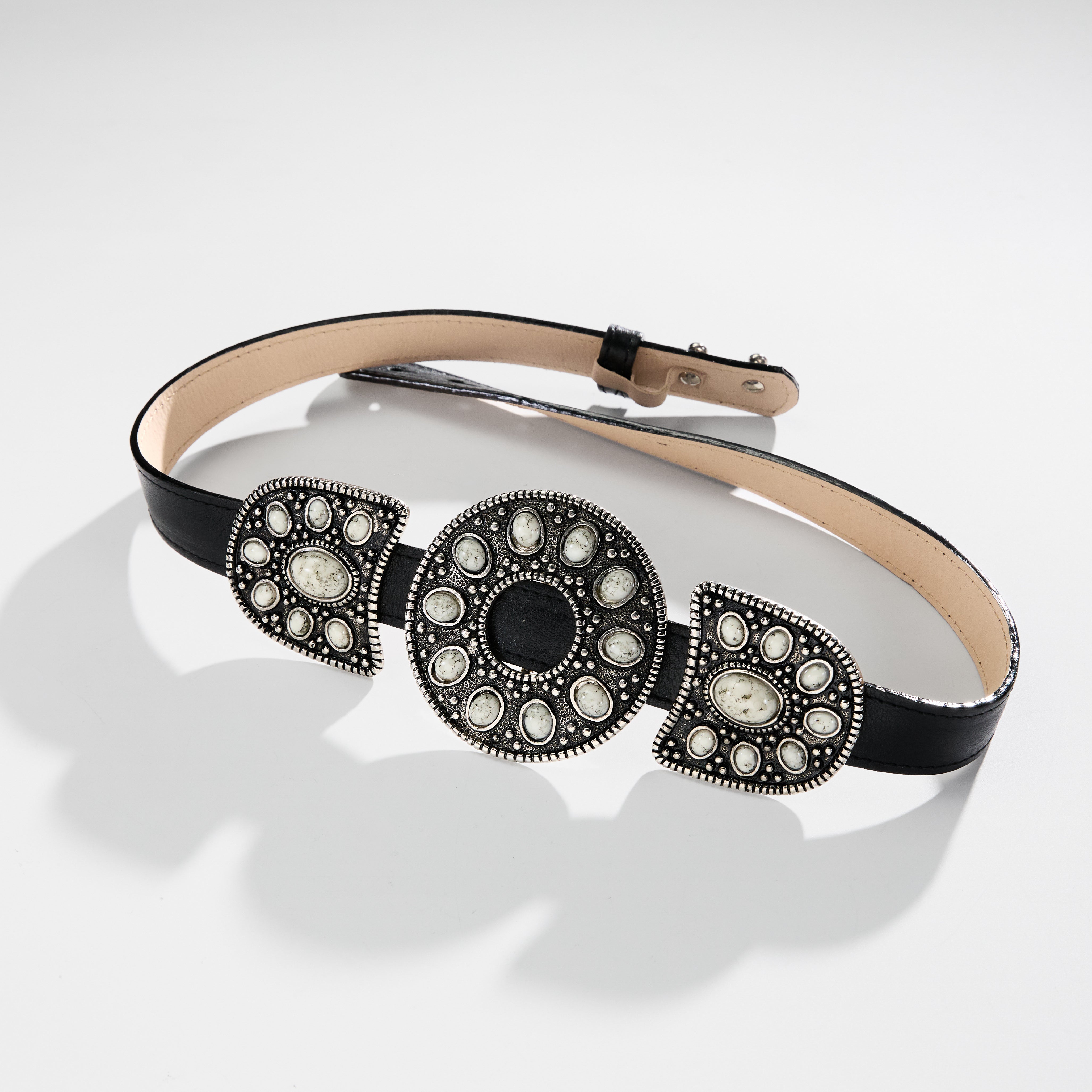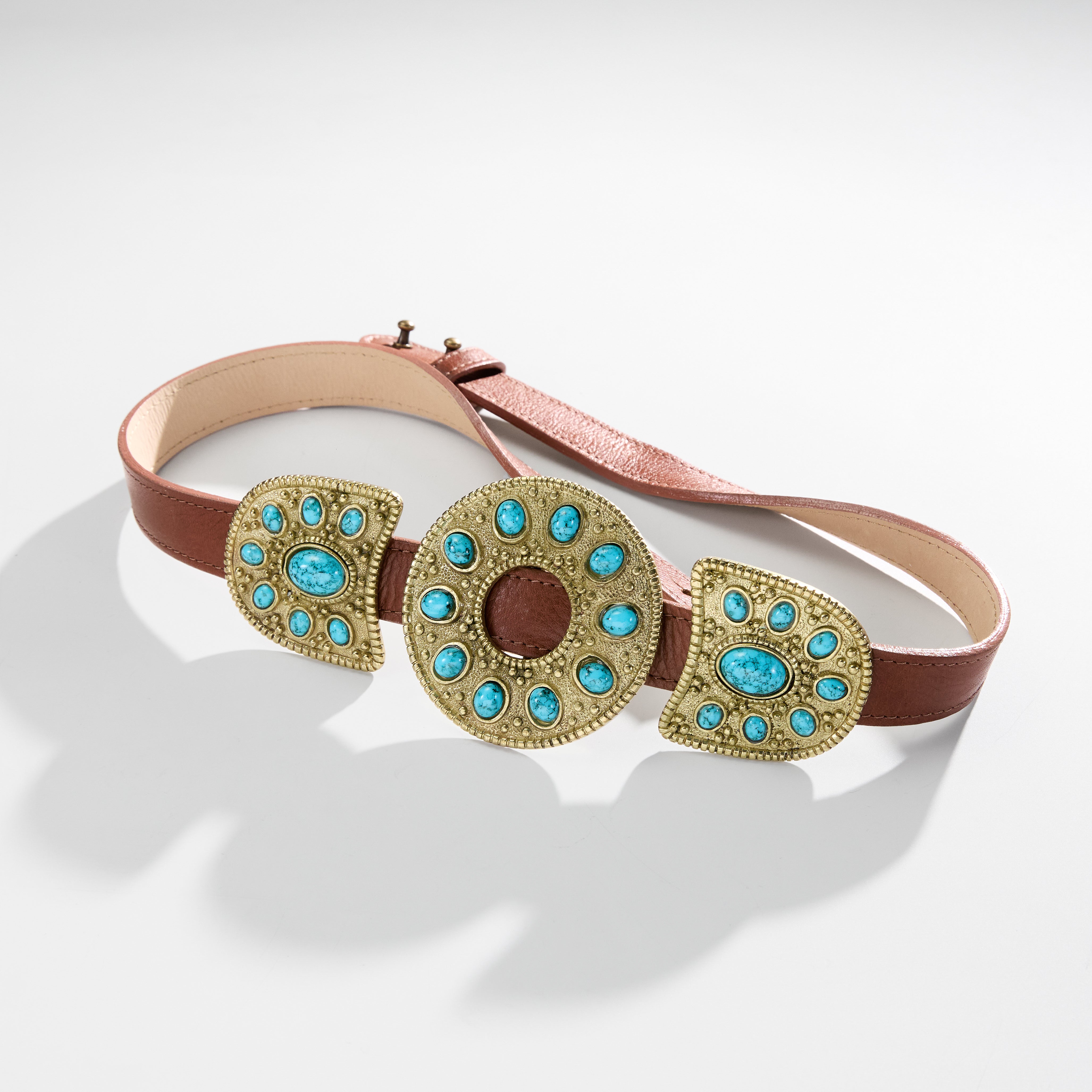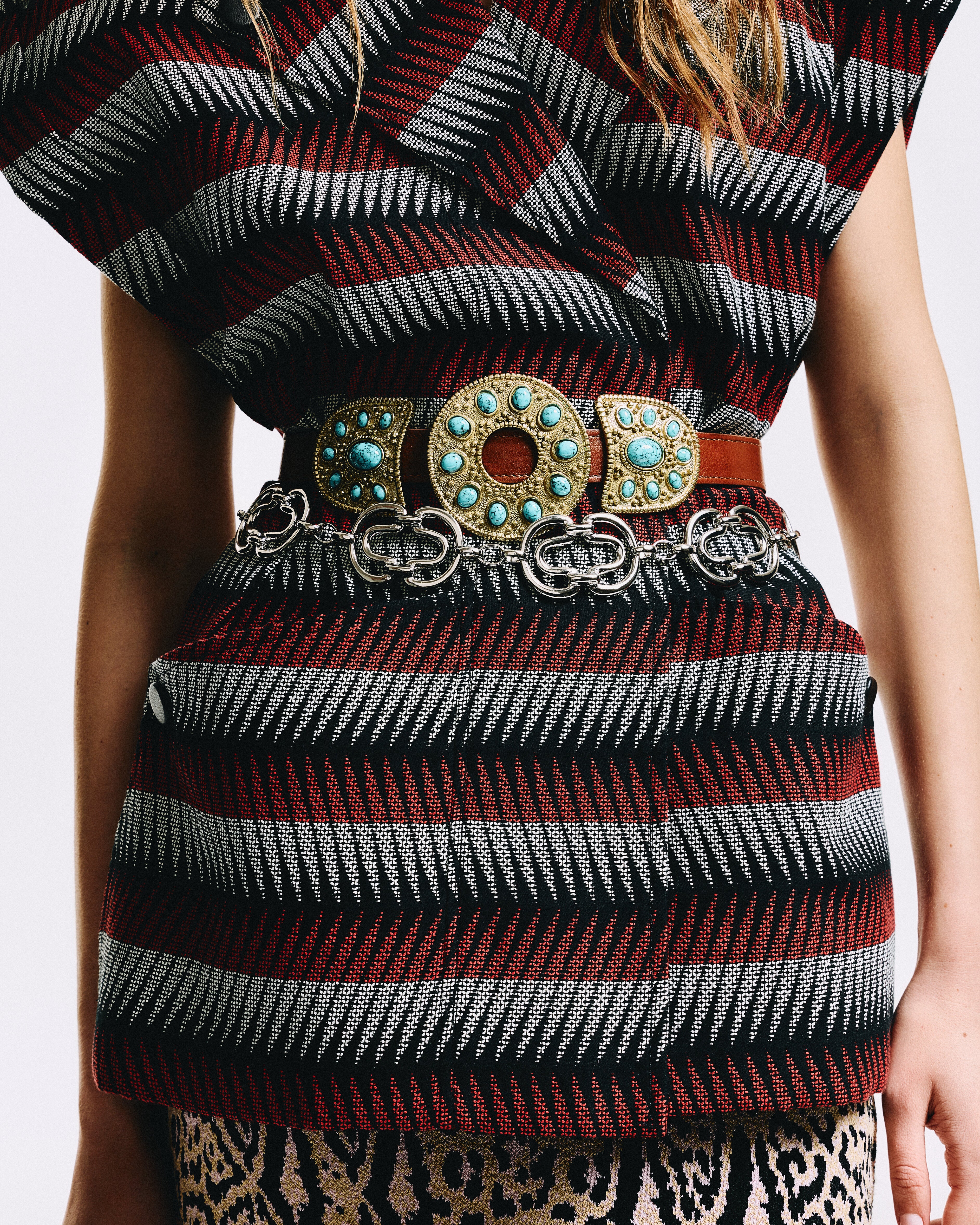 Uma explosão de cultura e cor para seu look! O cinto Grapa combina ferragens em padrões geométricos ancestrais com detalhes de pedras acrílicas turquesa e marfim. O contraste entre o couro natural e a tonalidade das pedras eleva produções casuais com a energia vibrante das "fiestas" de Tulum.