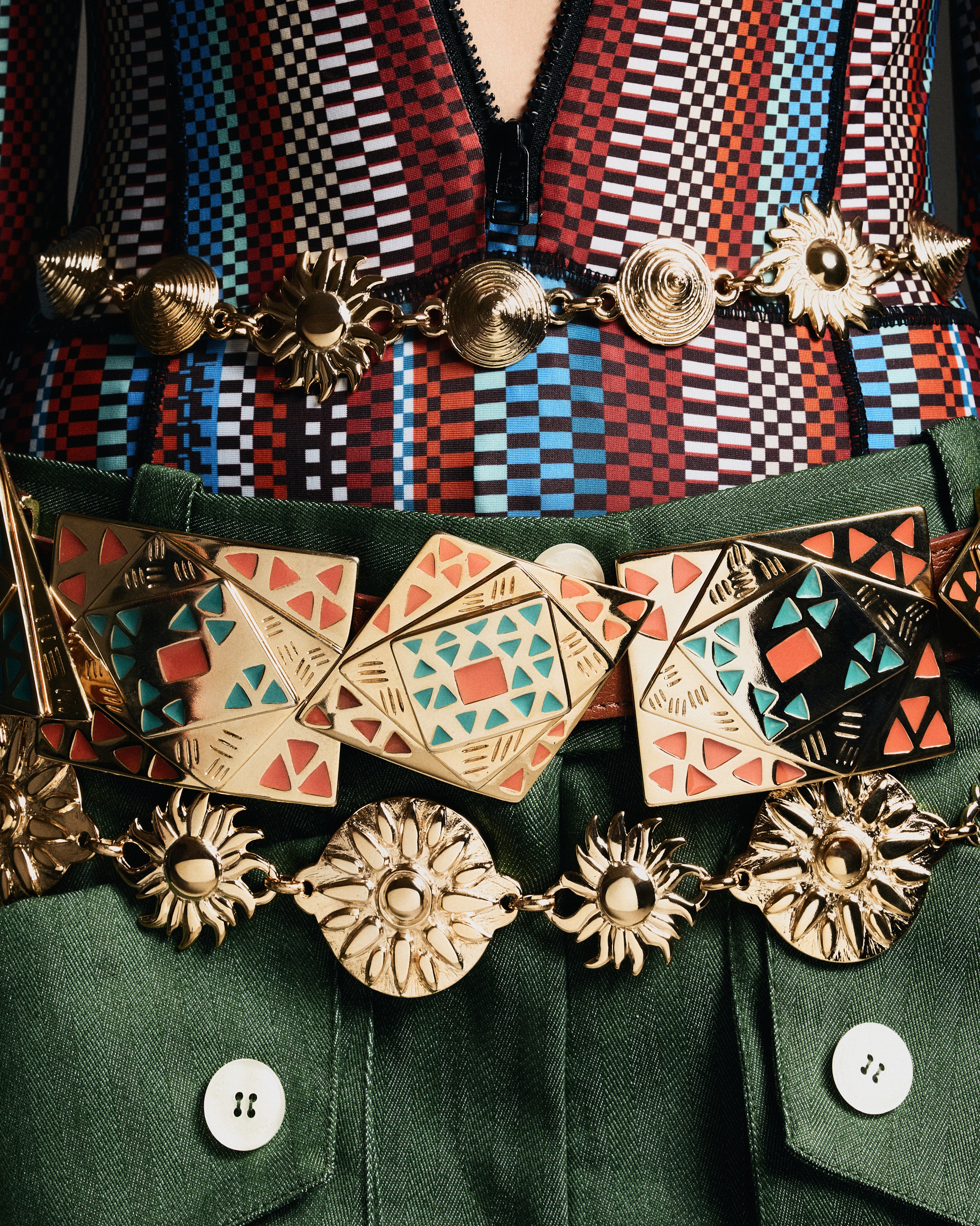 Guerito é sol e ilumina qualquer produção. Uma corrente de metal formada por peças desenhadas exclusivamente para edição Soluna, traz o sol misturado com spikes circulares que dão relevo e textura a esse cinto. Perfeito para compor looks com outras peças da nossa edição fazendo o "mix & match"que tanto amamos!